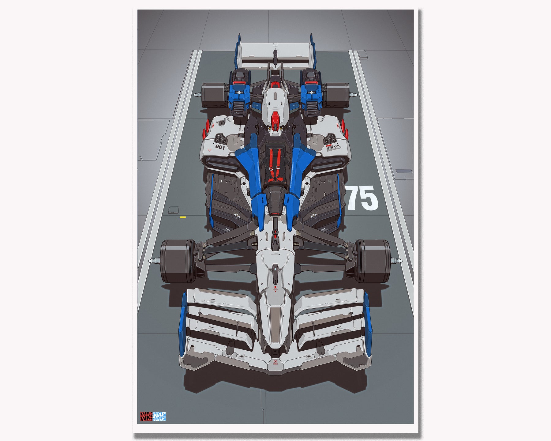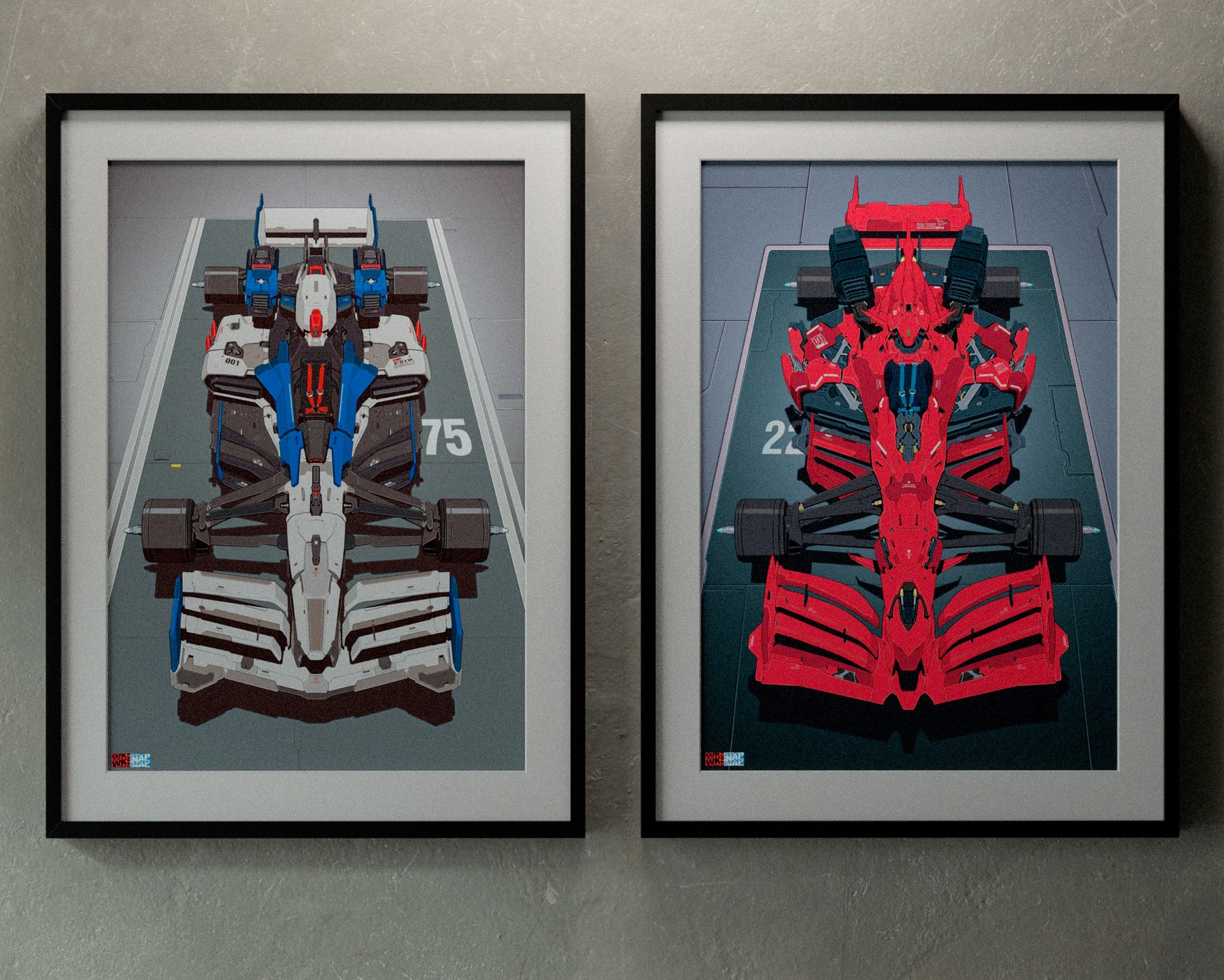We are proud to present 2 new limited edition prints from Walter Kim featuring his latest Anime/Motorsport Crossover homage concept "GUNDAM F1". These pieces were created with print in mind from the very beginning, utilizing a draw dropping 1440dpi with vibrant archival ink, on heavy hot press paper. They feature stunning detail and pixel density even at the 24"x36" size. The kind of piece you find yourself inches away from soaking up the detail.