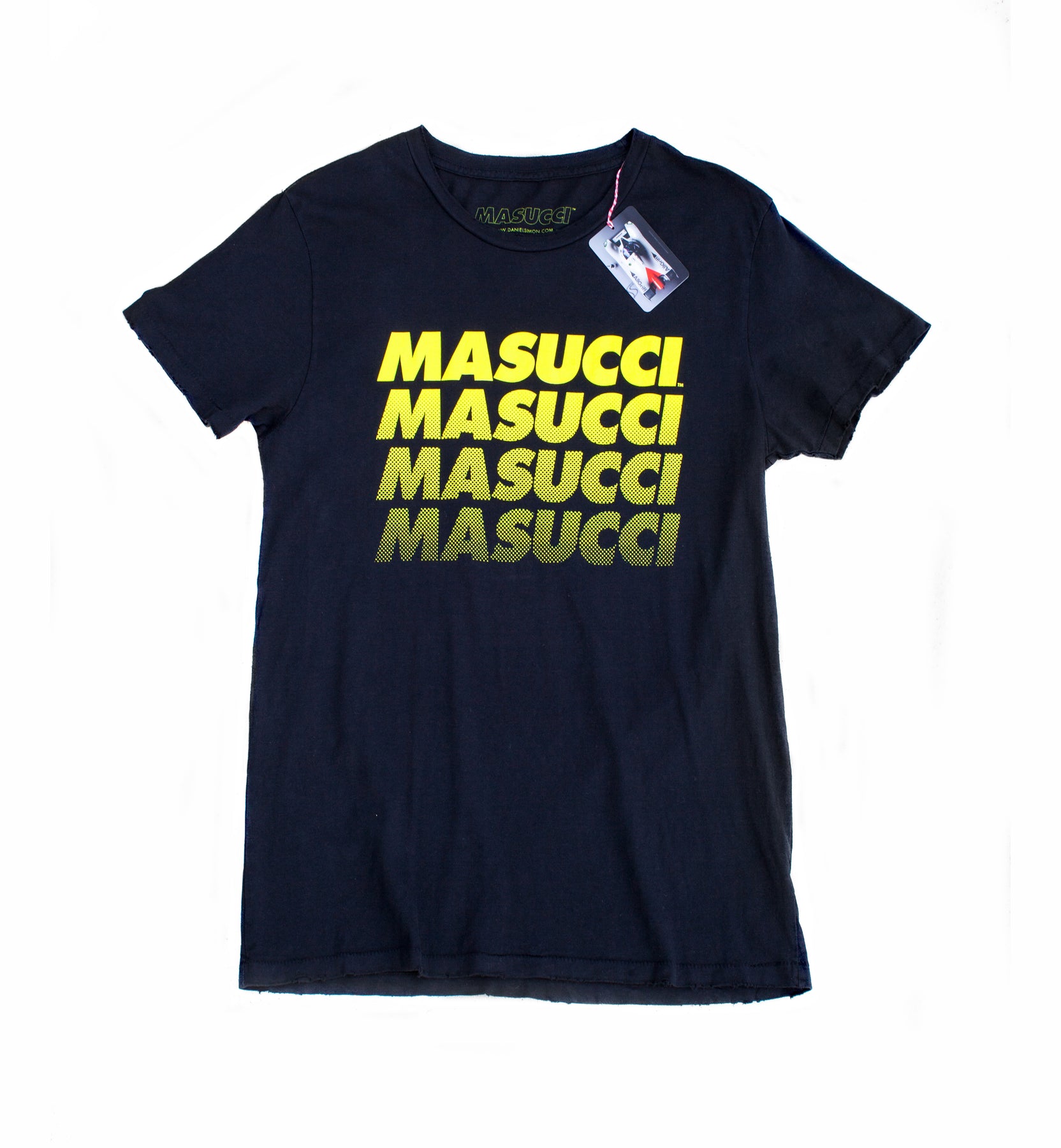 Printed in neon yellow and retro-cool half tone style, on anthrazit fabric with vintage distressed look on neck and sleeves. The inside neck print features insights into the history of Masucci racing. The shirt is designed, printed and packaged in California, with Daniel approving each single manufacturing step.
